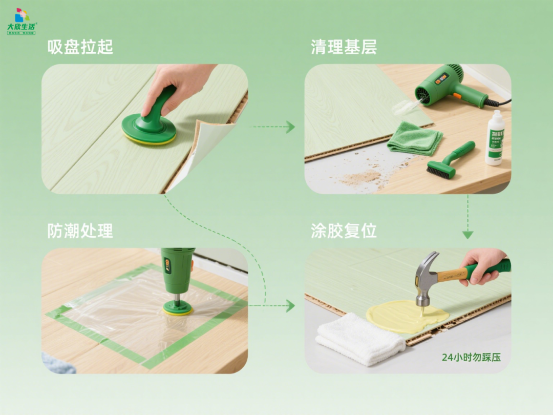 如果时单块地板边角翘起、表面鼓包。可以用吸盘吸住变形地板表面,轻轻向上拉起,然后清理基层残留的胶水和灰尘,若基层潮湿,用吹风机吹干后铺一层防潮膜。最后,在新地板背面均匀涂抹地板胶,对准缝隙放入原位,用锤子垫毛巾轻轻敲实,让胶水充分粘结,24 小时内别踩压。