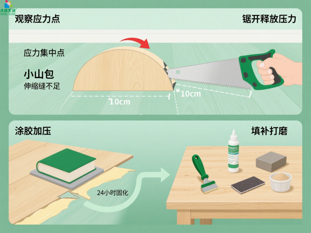 如果地板想上拱起,形成了“小山包”,严重时还导致了地板之间挤压变形。在维修前可以观察拱起最高处的地板,通常是伸缩缝不足导致的应力集中点。然后在拱起最严重的地板中间,用锯子横向锯开一条10cm长的缝,释放内部压力,让地板自然回落。待地板平整后,在锯开的缝隙处涂抹地板胶,用重物压住 24 小时固化,最后用同色木粉 + 胶水填补缝隙,打磨平整即可。